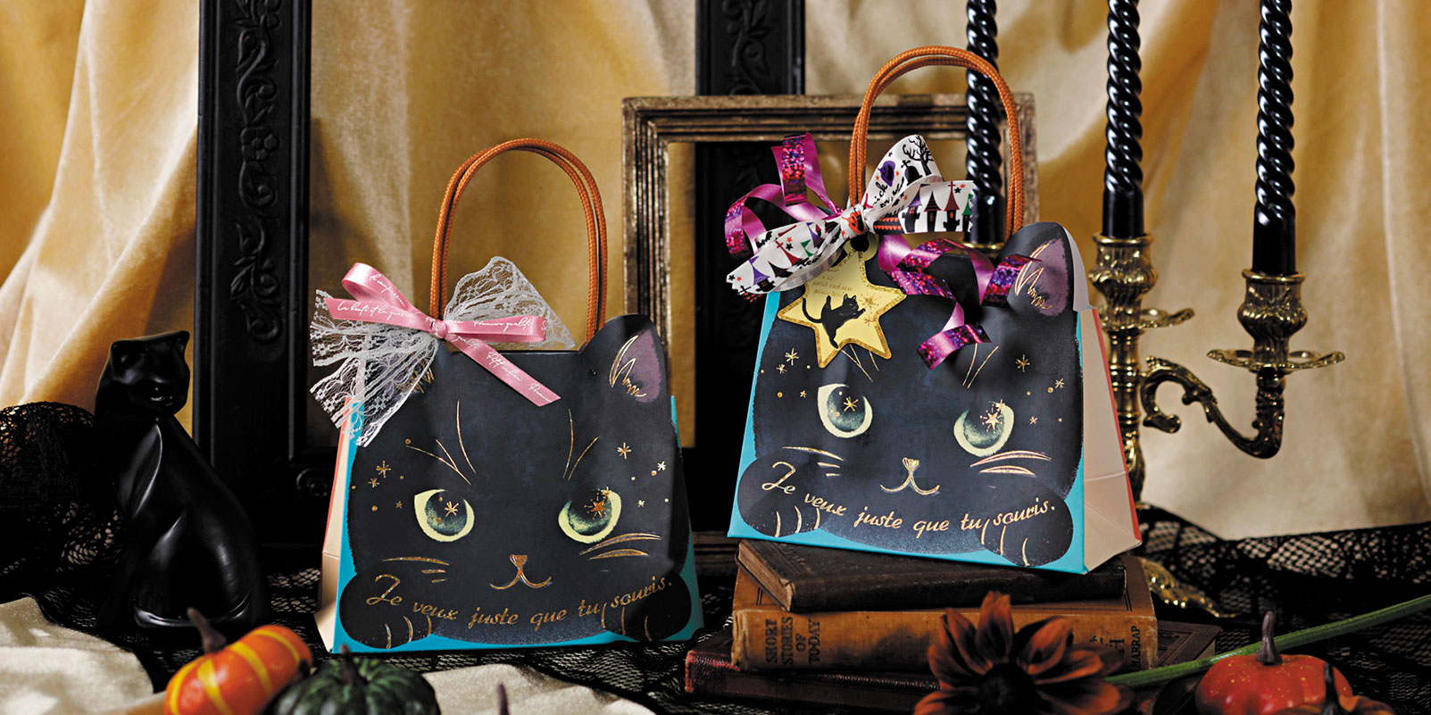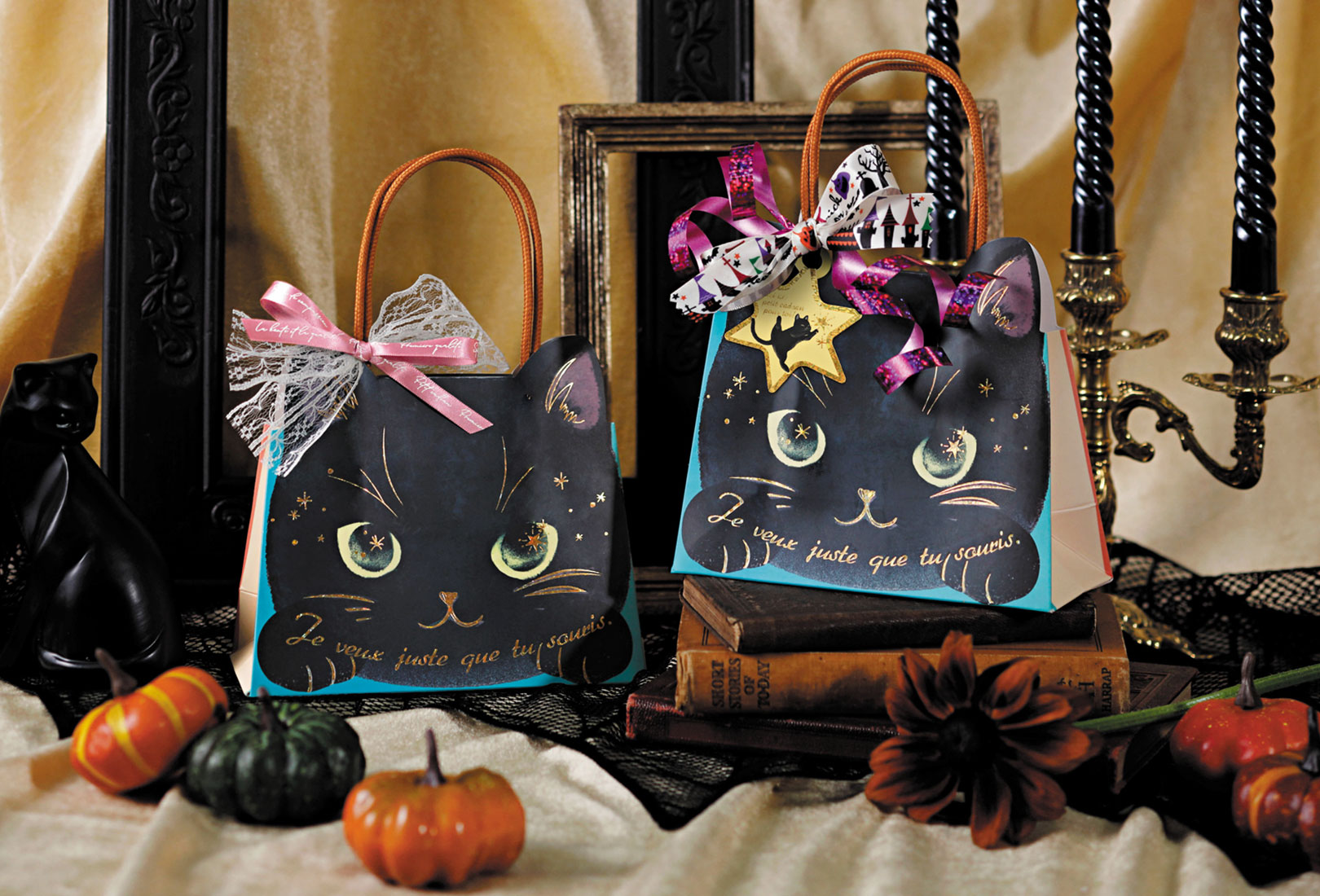 黒猫のハロウィーン特集。オレンジや紫のハロウィーンカラーをあえて使わず、黒猫本来の可愛らしさを引き出したデザイン。ハロウィーンシーズンはもちろん、通年でも活躍するアイテムです。